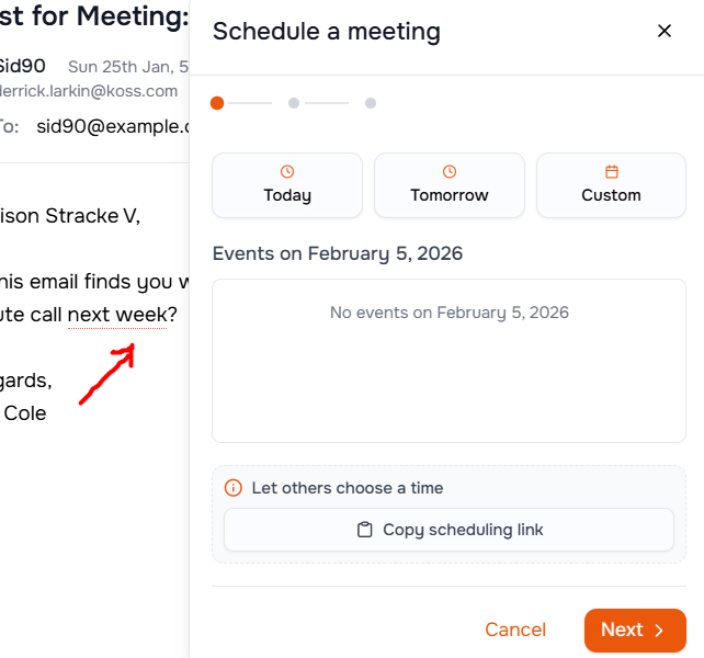 AI detects dates in emails and converts them to schedulable events. One-click booking with clients.